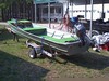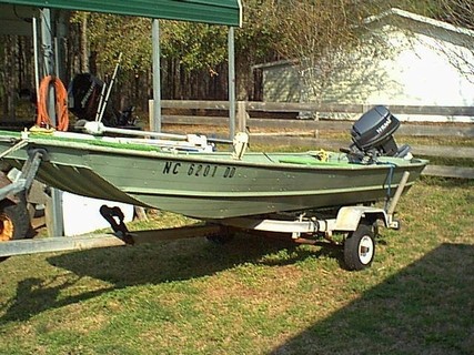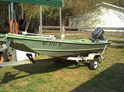 14 ft Jon boat with new 25hp Yamaha. Long trailer. False botom and seats carpeted. Life jackets,throw cushion, fire extingisher,anchor,Motor Guide trolling motor, battery and box, Eagle Fishfinder with battery volts and water temp, bulge pump. Yamaha still under factory warranty until 7/2008. Like all older riveted boats, it leaks some, but not bad. Ready to fish. Reason for sale is I bought a bigger boat. Was going to make a flounder gigging boat out of it but the wife said one boat is enough. Engine is worth asking price alone.